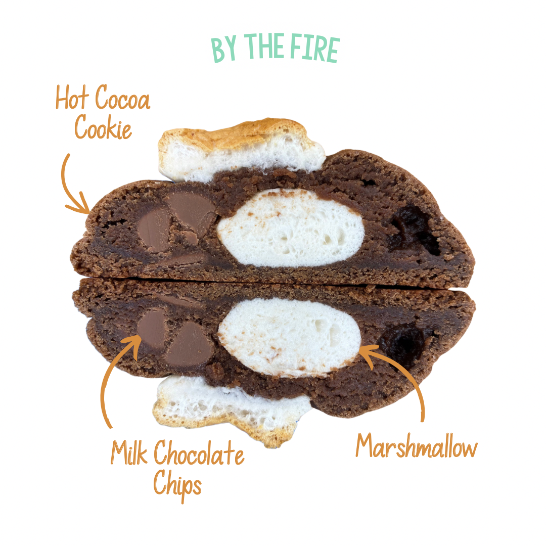 Hot cocoa cookie with milk chocolate chips stuffed with a marshmallow & topped with a toasted marshmallow.