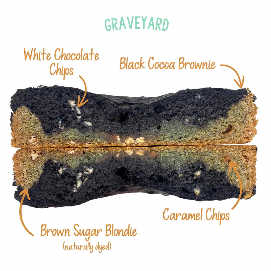 A naturally dyed brown sugar blondie with natural caramel chips topped with a black cocoa brownie with white chocolate chips.
